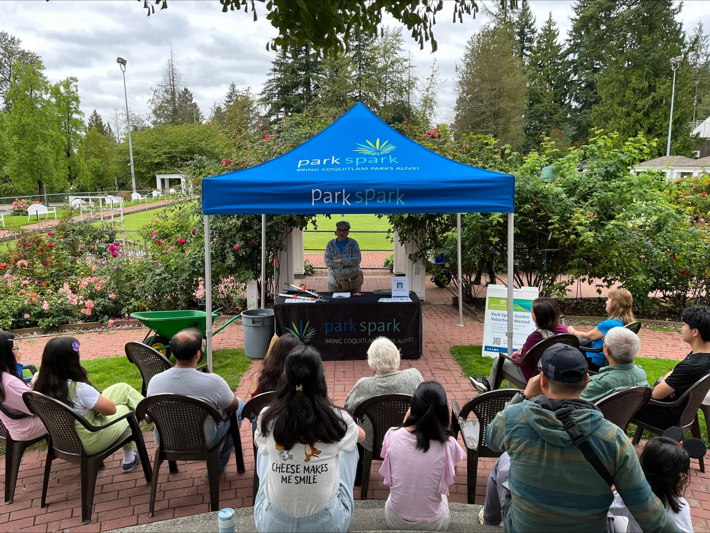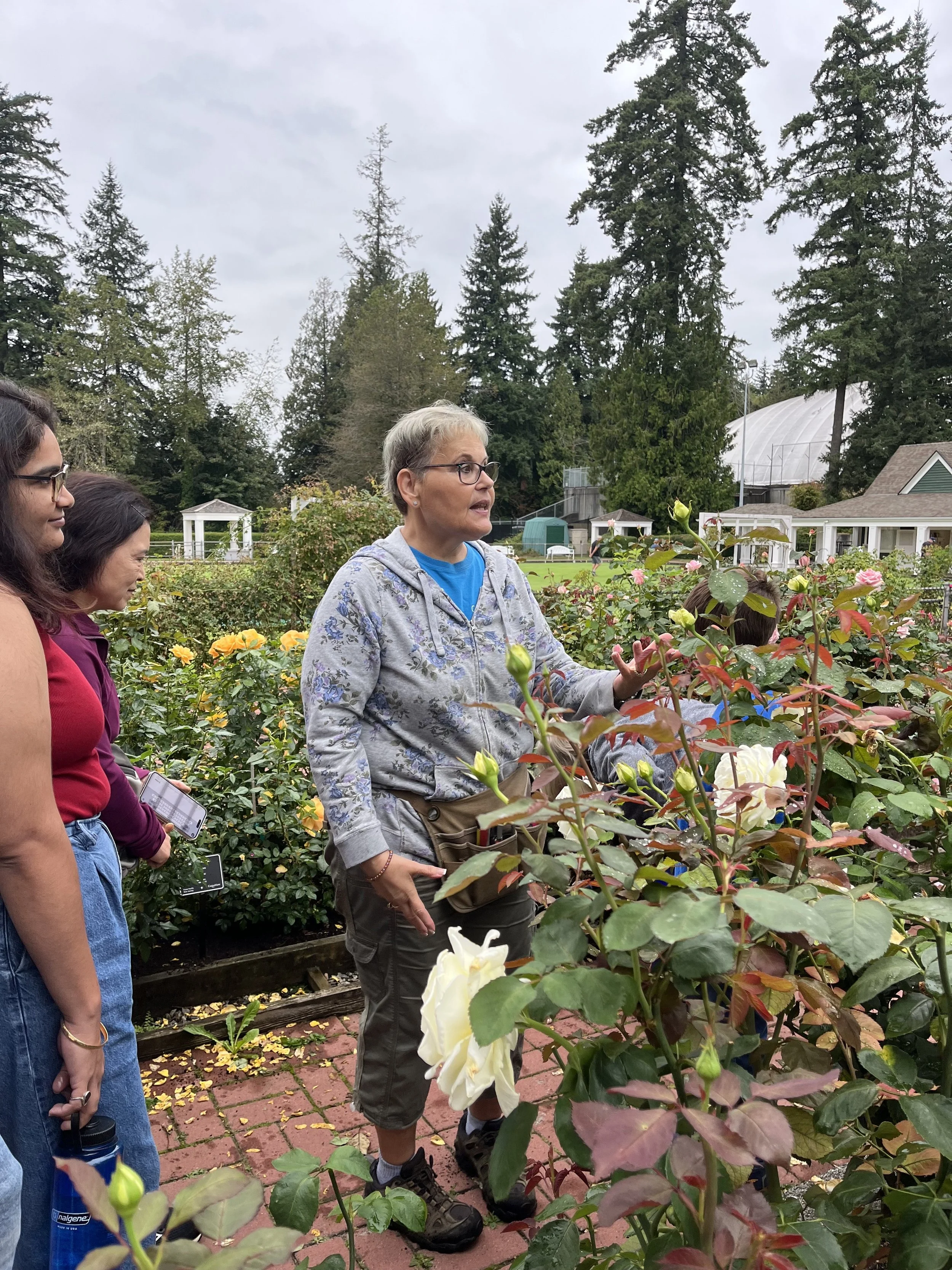 Participants discussed mid-season pruning, fertilizing and some rose pests and diseases. As well they had hands-on experience spotting blind shoots and examining rootstocks. Garden tools used were purchased with our Coquitlam Spirit Grant.